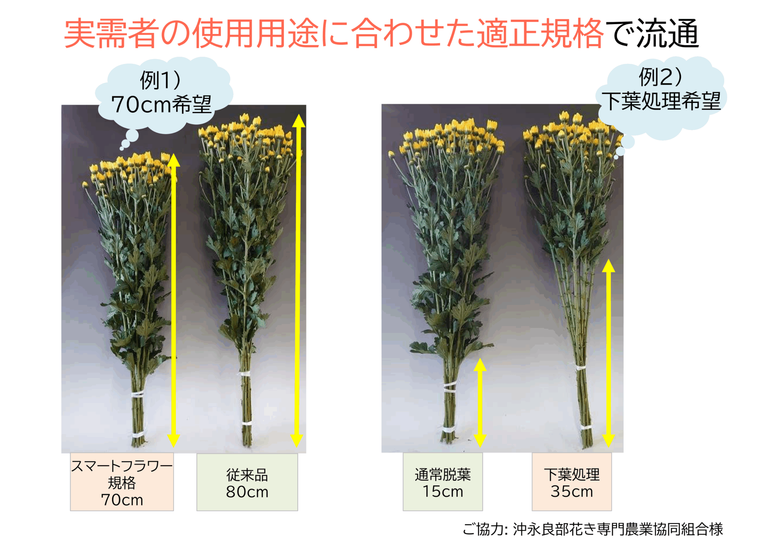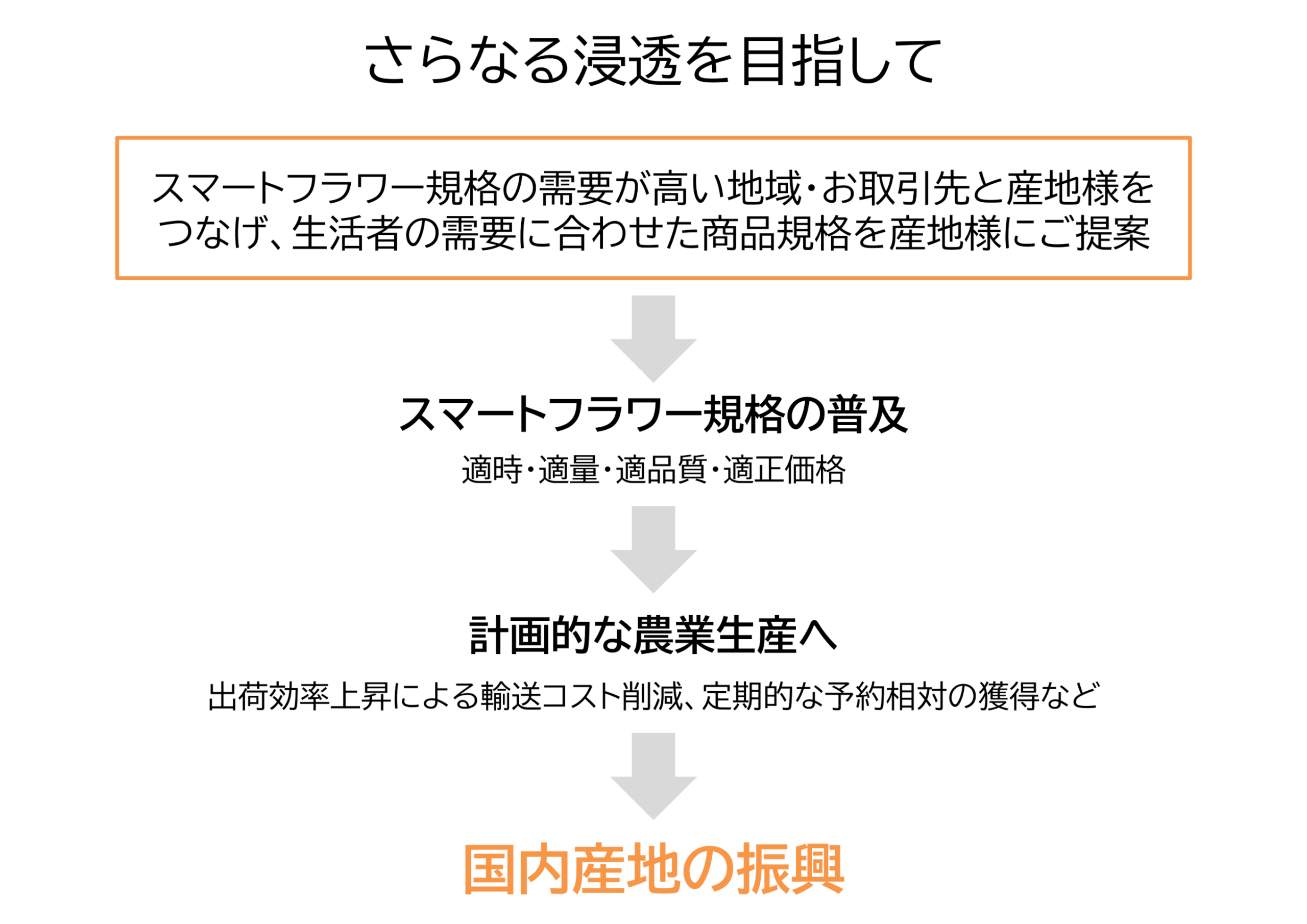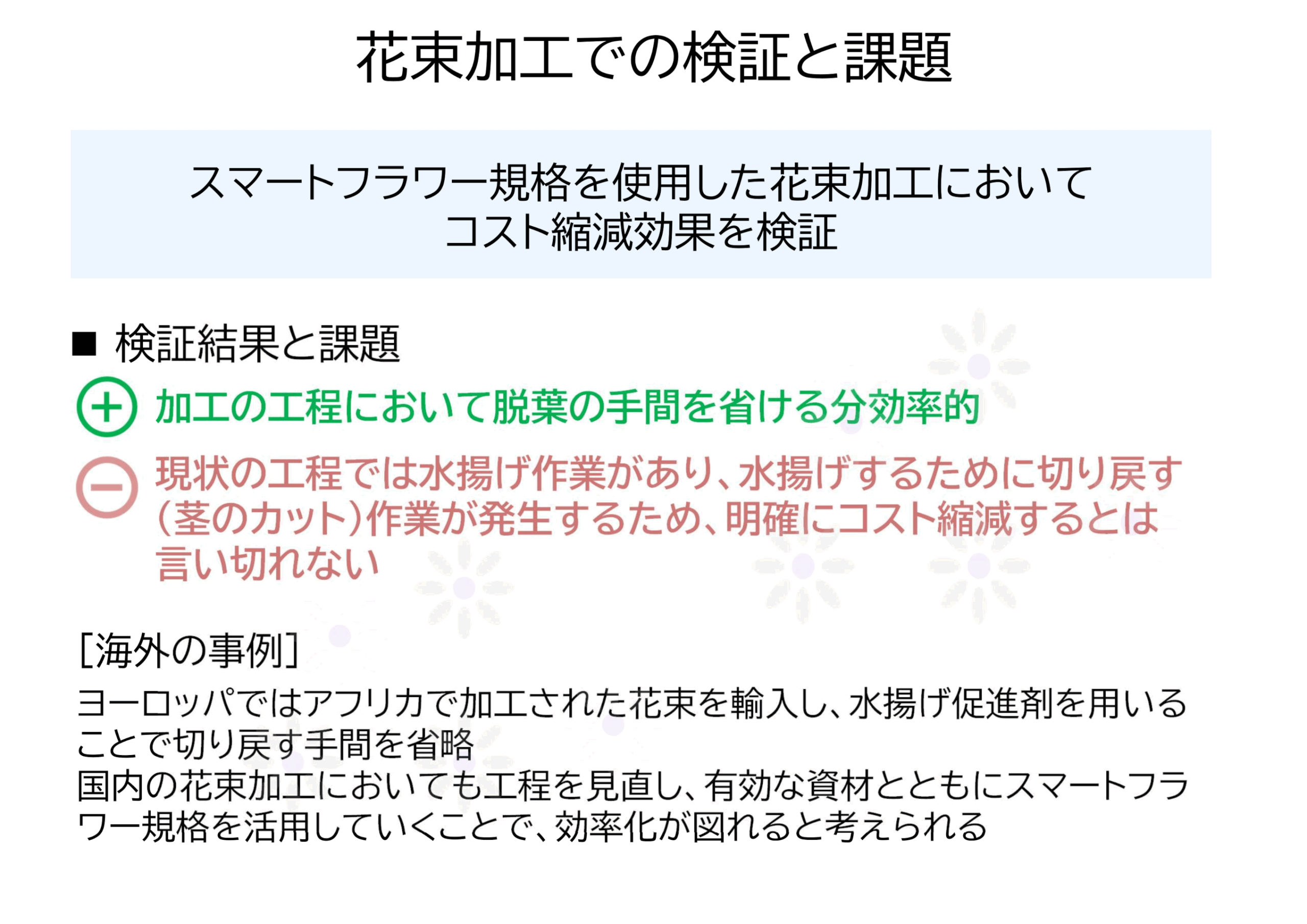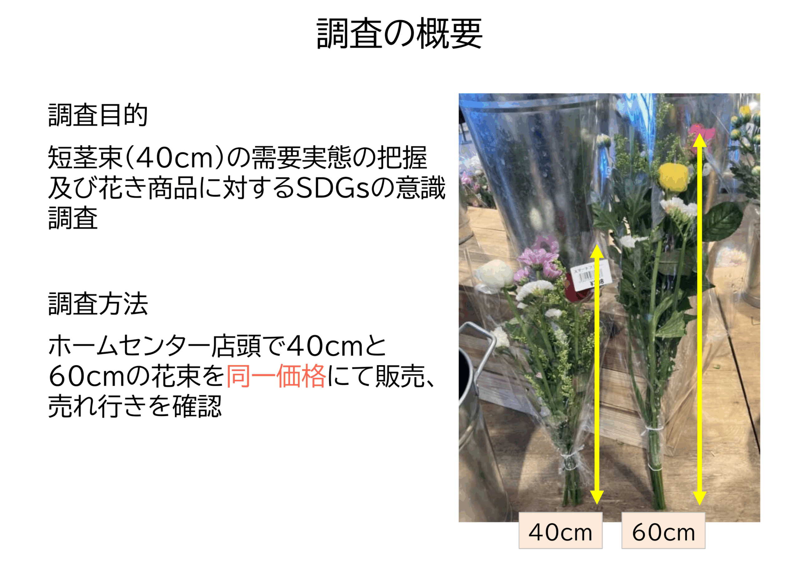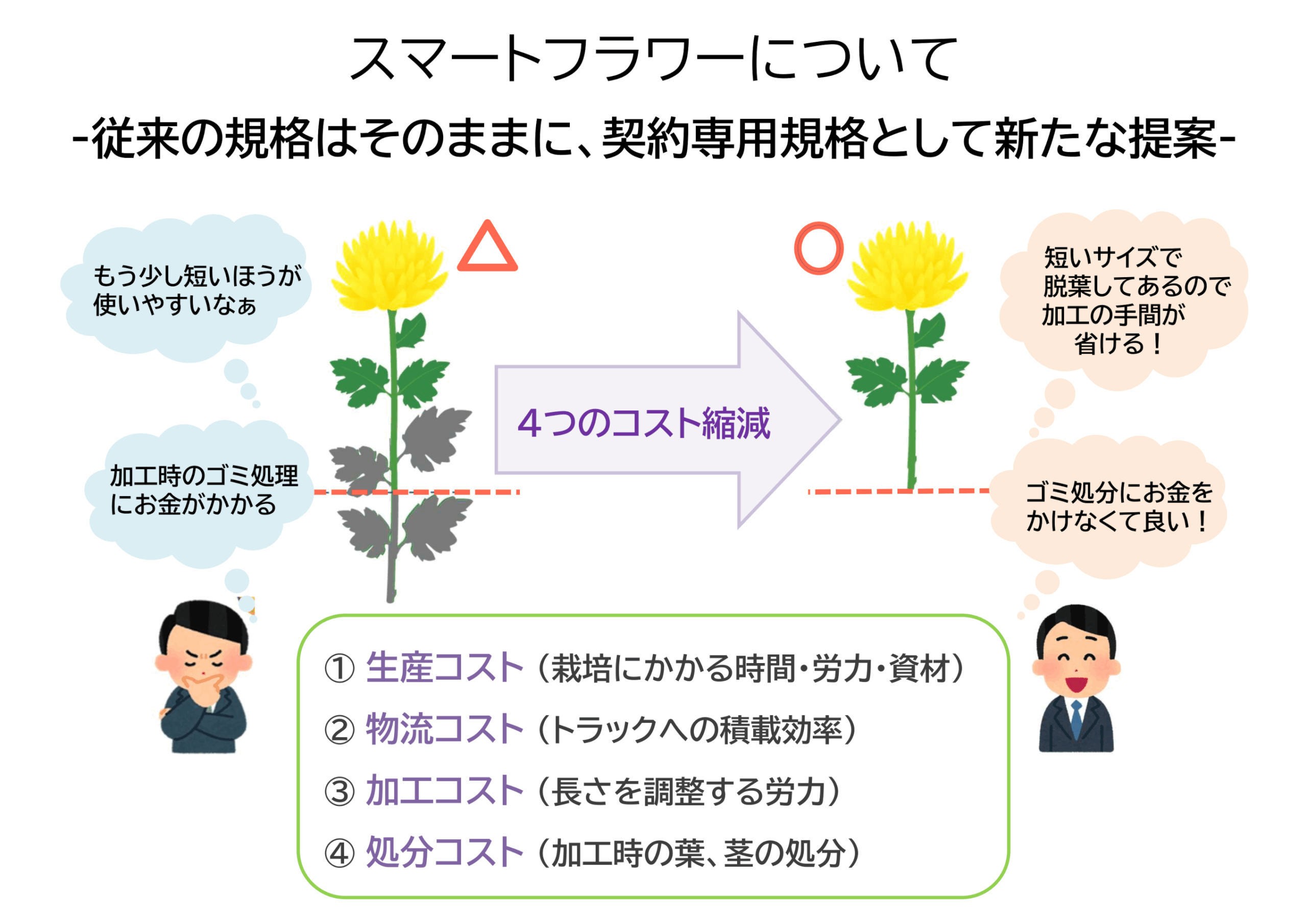 スマートフラワーの取り組み スマートフラワーについて 短茎束の需要調査(2023年度) コスト縮減効果検証(2024年度) さらなる浸透に向けて 1. スマートフラワーについて 2. 短茎束の需要調査(2023年度) 3. コスト縮減効果検証(2024年度) 4. さらなる浸透に向けて