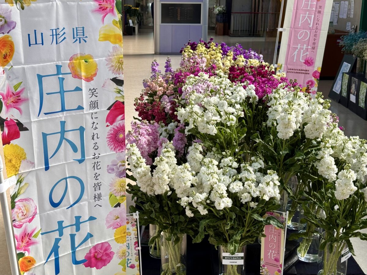 今週は庄内産花きフェアとして、ストックを中心とした庄内産の花をショーケースに展示しております。丹精込めて作った庄内産の花をぜひお立ち寄りいただきご覧ください。