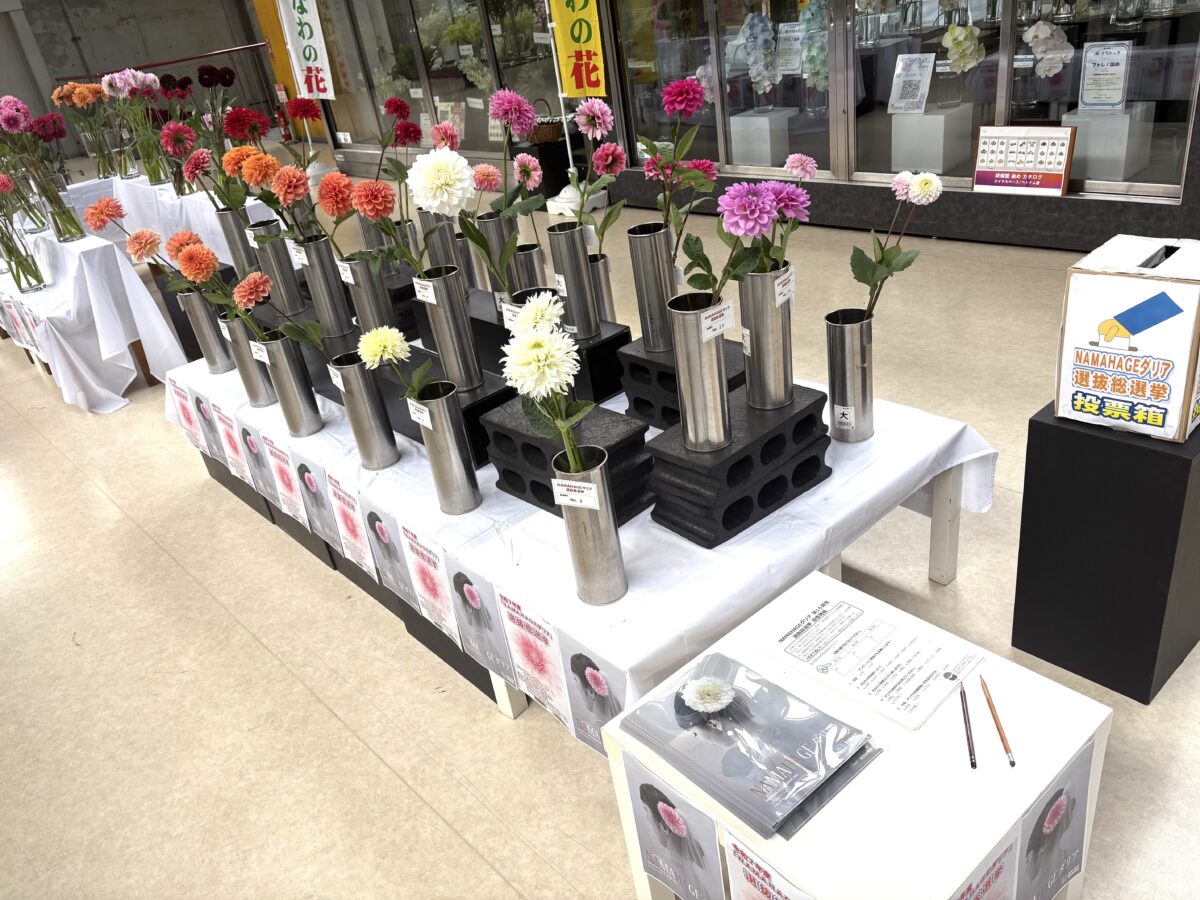 ただいま、2階の中央通路と1階仲卸通路にNAMAHAGEダリアの候補品種を展示し、未来のNAMAHAGEダリアを選ぶ人気投票を行っております。