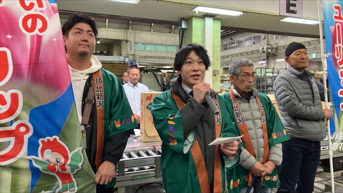 本日は、チューリップ切花生産者3名と、これから出荷のピークを迎える当産地のチューリップ切花のPRを兼ね、一言あいさつをいたします。