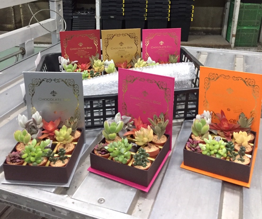 こちらは可愛らしいBOXにチョコレートが詰め込まれたような見た目の多肉植物セットとなっております。