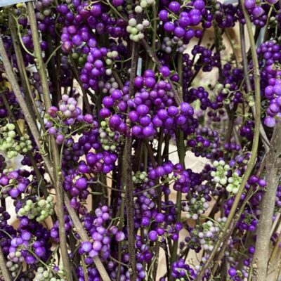 もうひとつの楽しみは、実ものを観賞できることです。実は結実を意味し、希望が実現できそうなうれしい気持ちになります。ムラサキシキブは、源氏物語の作者である紫式部にちなんでつけられたといわれ、わが国原産でクマツヅラ科の落葉低木。英名で、ジャパニーズ・ビューティ・ベリー(日本の美しい果実)とも呼ばれています。6~7月頃、かすかな香りがする小さな淡紫の花を咲かせ、その後球状の実をつけ、紫色に色づきます。材は強く丈夫で、箸や傘の柄や木炭などにも使われる生活に密着した植物でもあります。