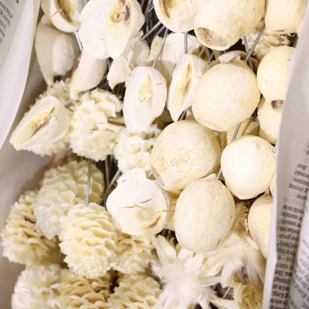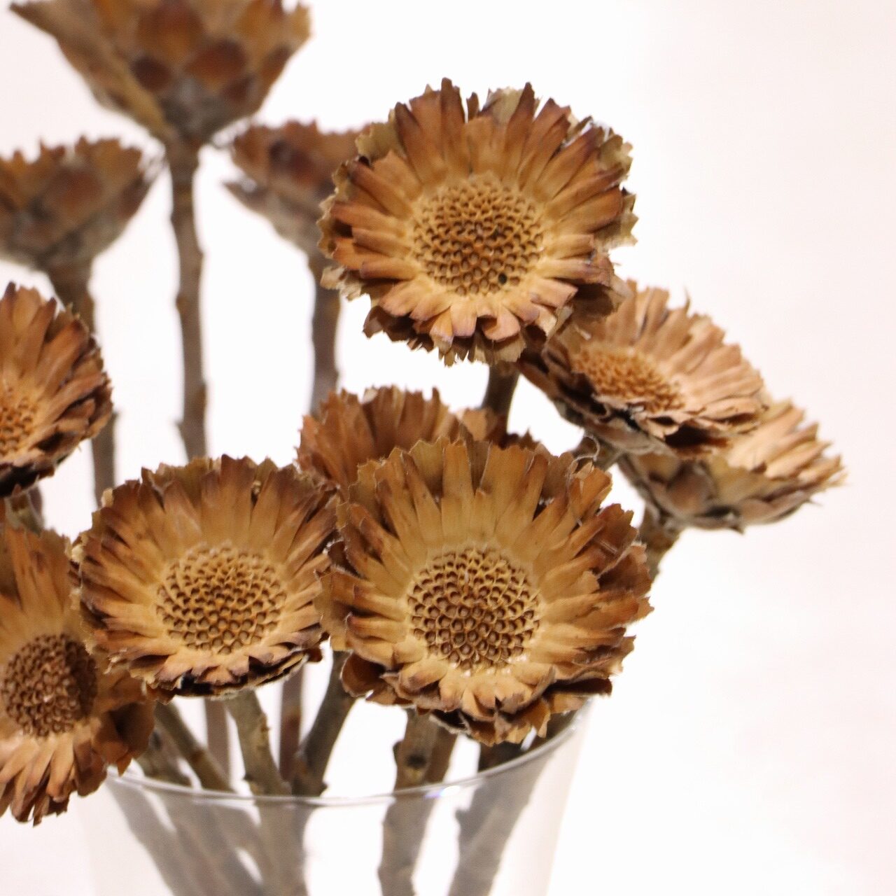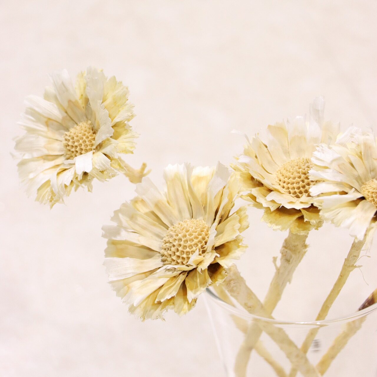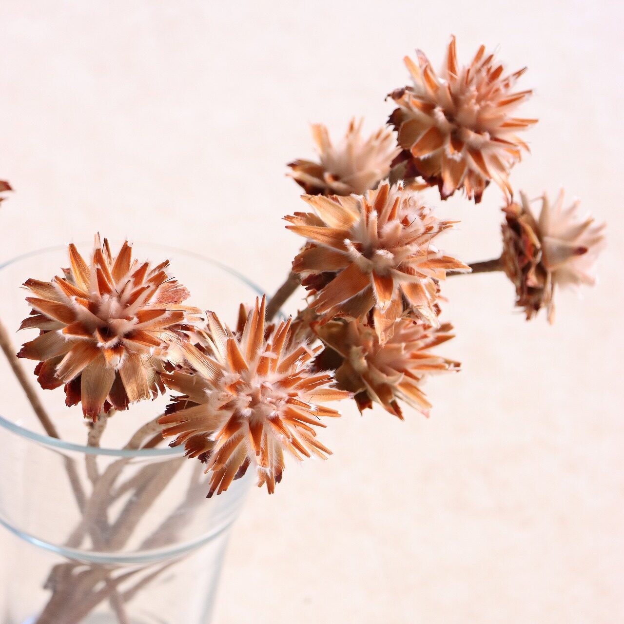 収穫後すぐに乾燥処理を行うことで、自然な色合いや質感を残しつつ長期間楽しめるドライフラワー。中国や南アフリカ、ドイツ等からセレクトし、トレンド感のあるカラーや形状を揃えています。