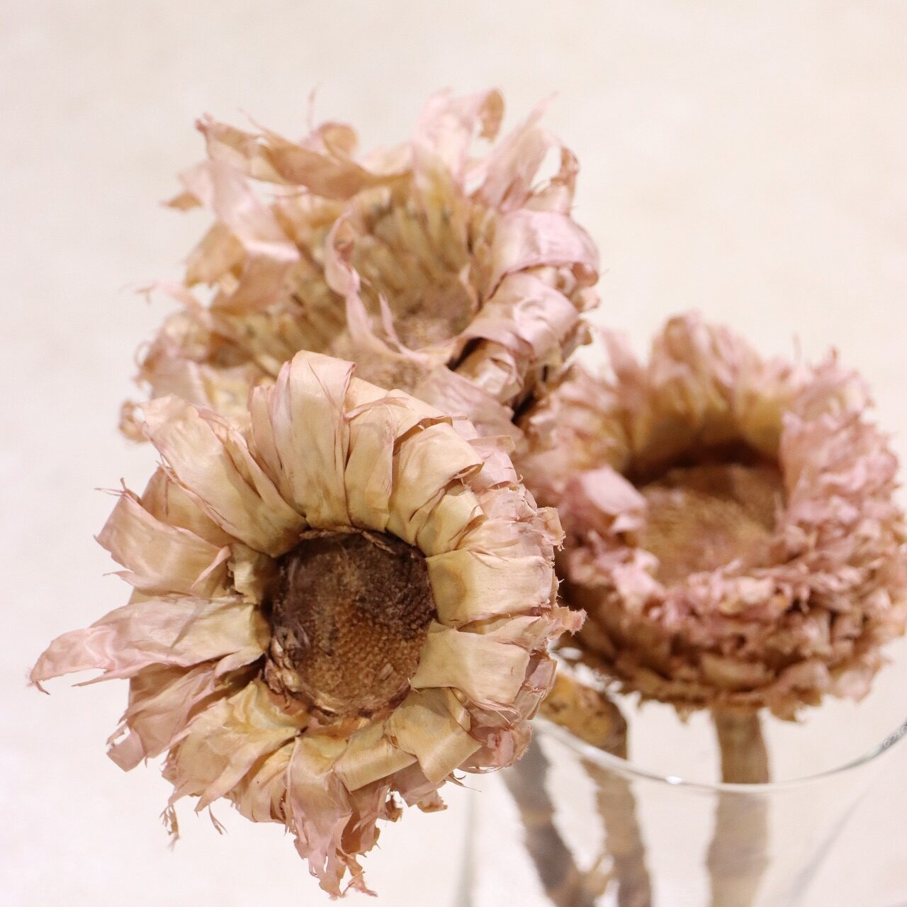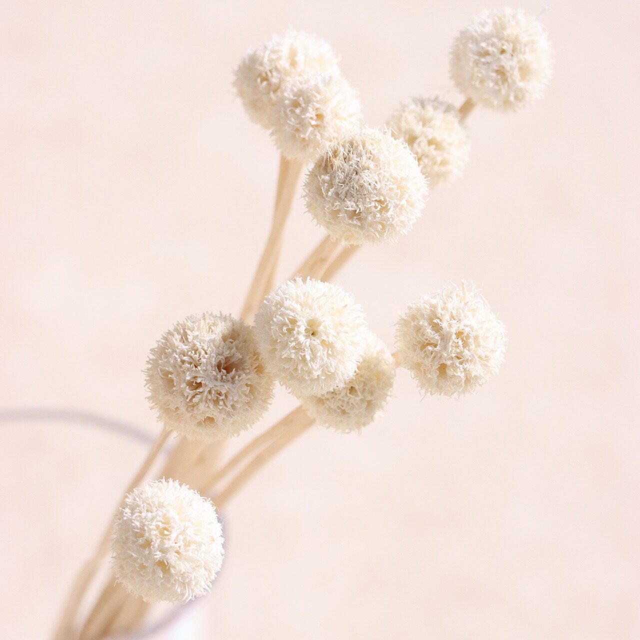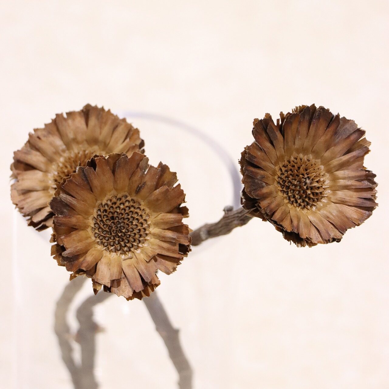 収穫後すぐに乾燥処理を行うことで、自然な色合いや質感を残しつつ長期間楽しめるドライフラワー。中国や南アフリカ、ドイツ等からセレクトし、トレンド感のあるカラーや形状を揃えています。