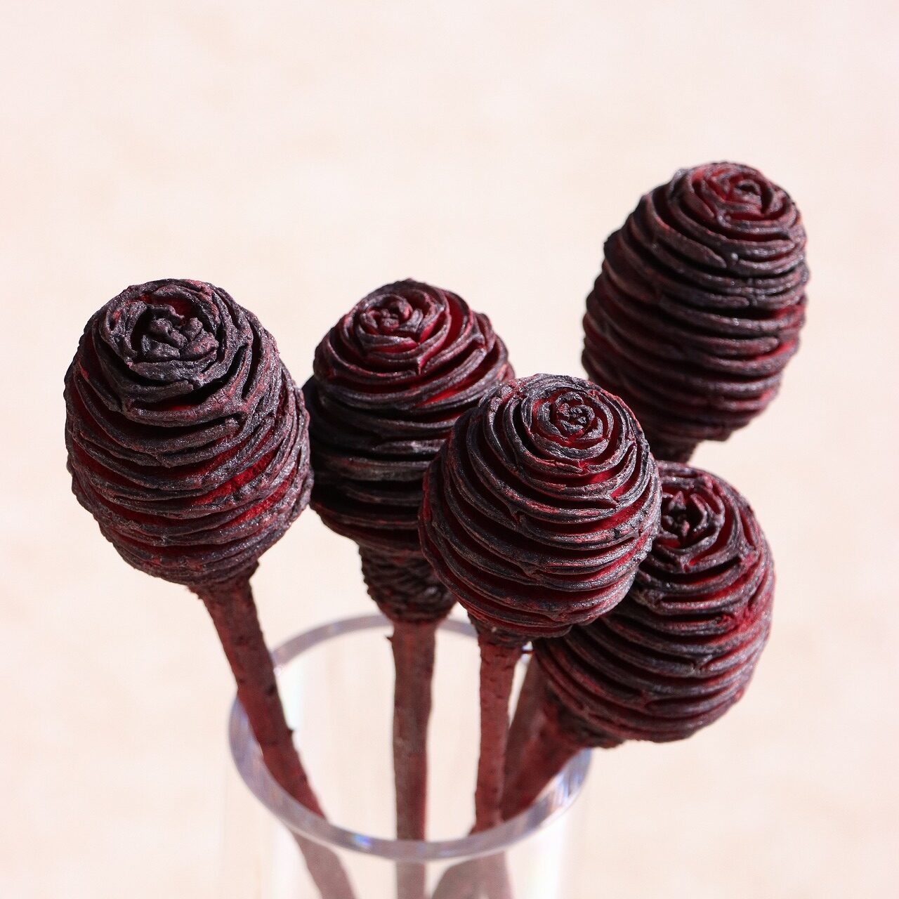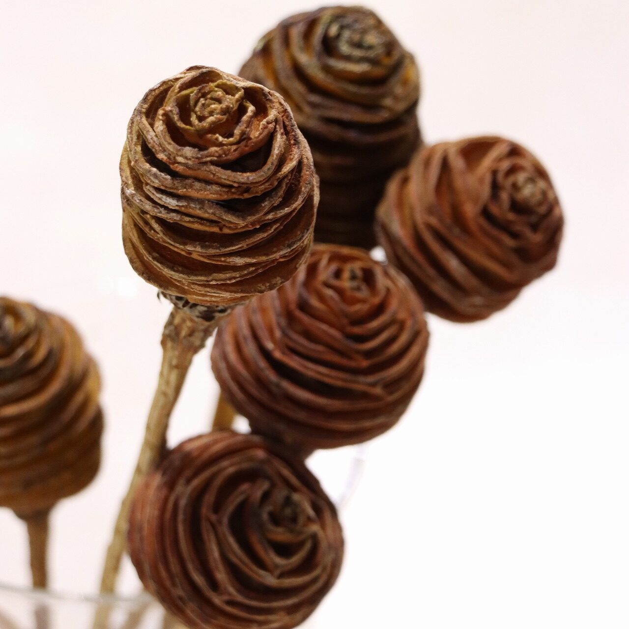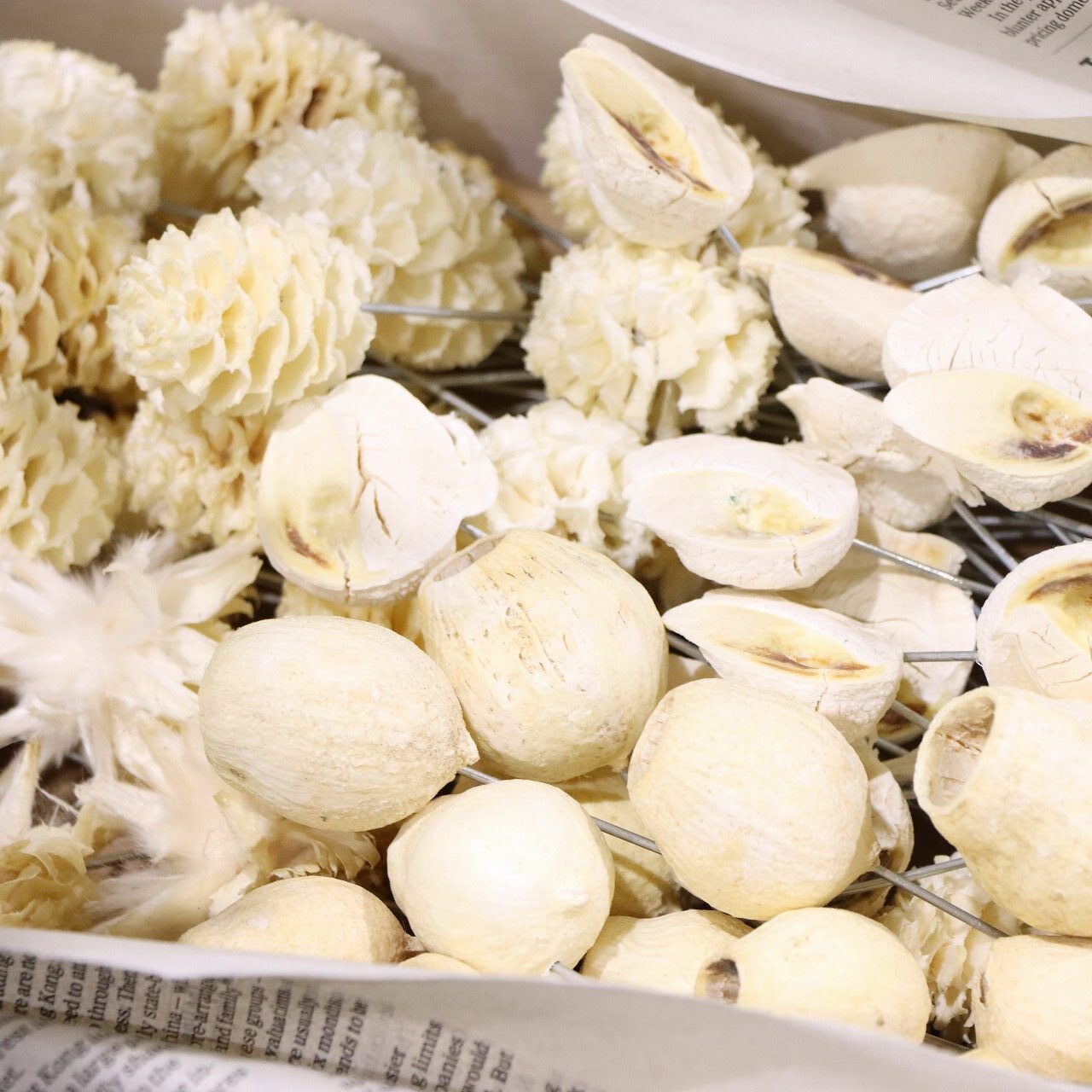 ヘッドのみ、ステム付き、ワイヤー付き、晒し、乾燥素材ならではのナチュラルな風合いや、デザインのポイントとなるようなカラーリング素材など幅広いです!