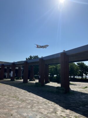 京浜運河をはさんで対岸にある羽田空港に駐機中の旅客機を見ながら