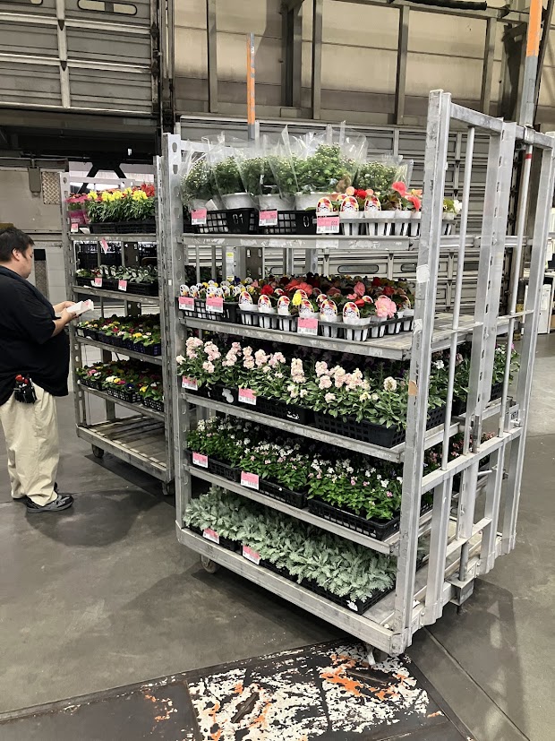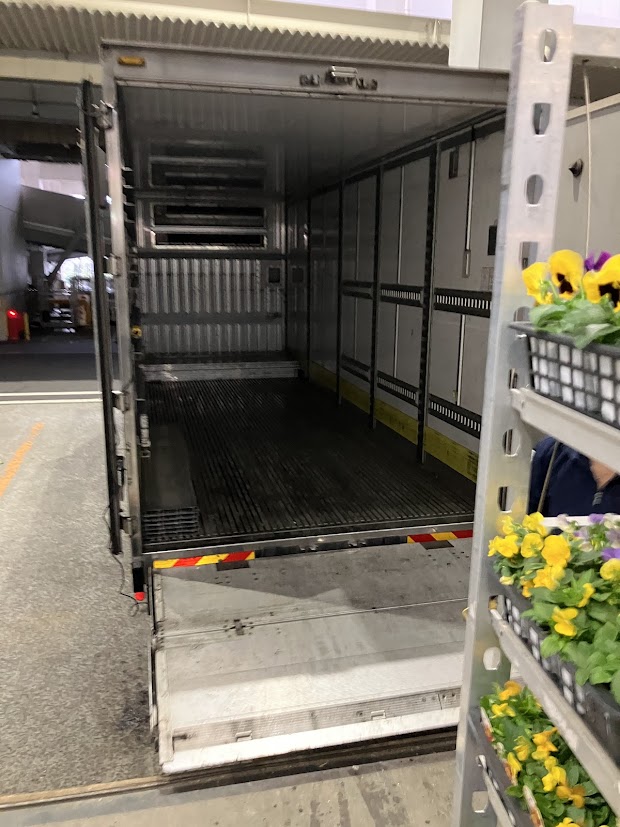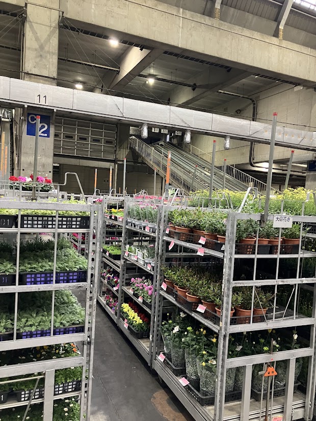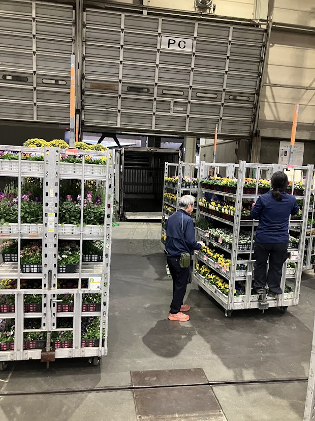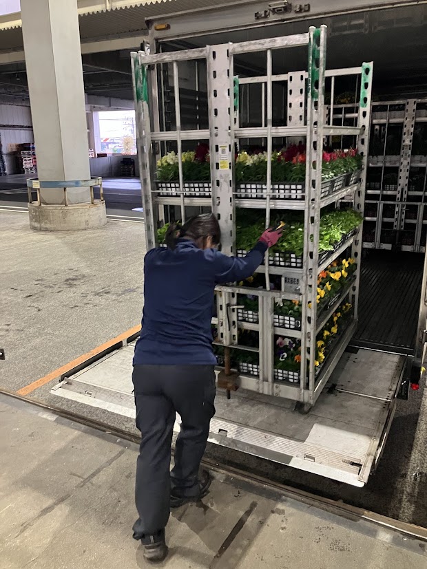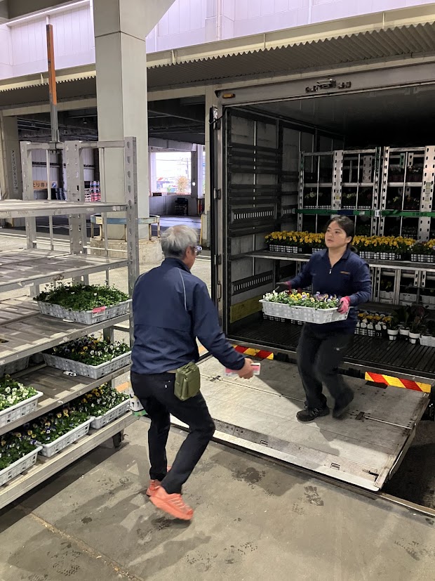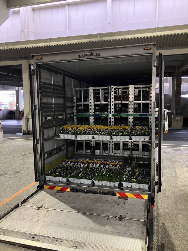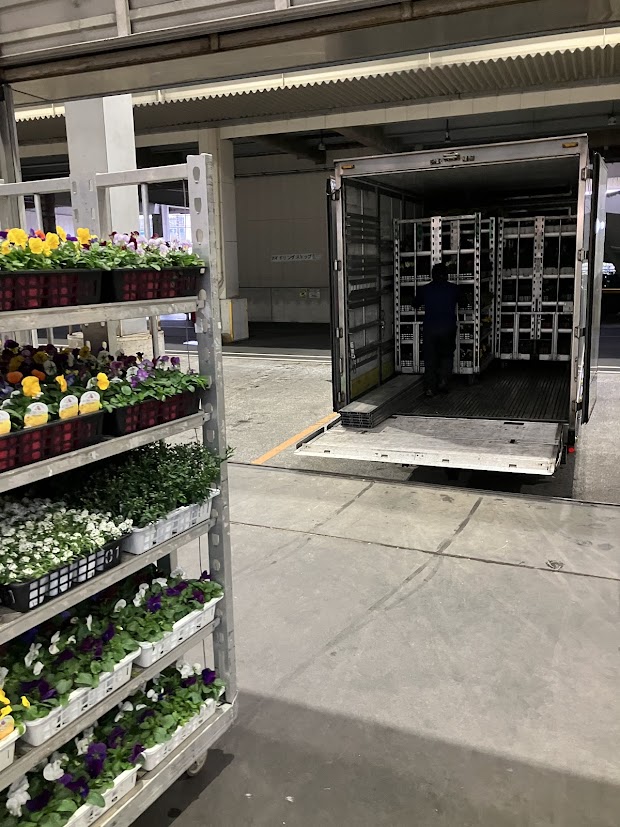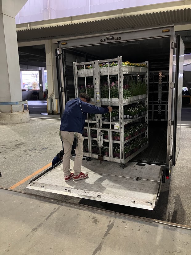 以前は、園芸品(鉢物類)の荷受け作業を一鉢(一トレー)ずつ手渡しで行っておりましたが、現在では台車輸送を導入し、作業効率が大幅に向上しております。これにより、荷降ろしや場内管理がスムーズになり、下見にお越しになるお花屋さんにも分かりやすく陳列できるようになりました。
