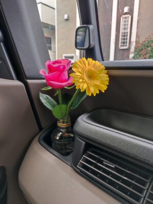 このブログを機に私も車用の一輪挿買ってみようかと思い、カー用品の量販店に行ってみましたが見当たりませんでした。そこで小さ目なペットボトルを一輪挿の代わりにして(ちょっと大きいかも)花を飾ってみましたが結構いい感じです。車の内装は黒っぽいものが多いですが、車内がパット明るくなって優雅な気分になれました。