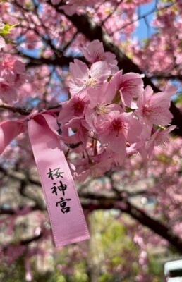この日は暖かく、御朱印とお守り購入の列は2時間待ちであったため、花粉症の私は耐えられず購入はできませんでした。しかしピンクのリボンで飾られた鮮やかな河津桜を見られただけでも十分な思い出になりました。