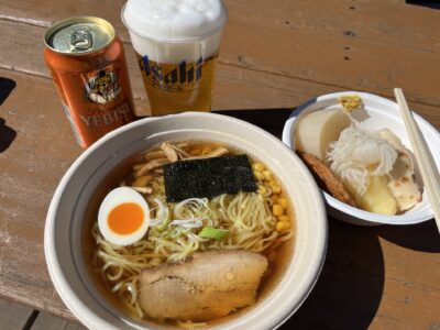 生ビール1杯1000円、缶ビール350m600円、ラーメンおでん各1000円と山価格の販売ですが、この景色の中での食事はさらにおいしさを引き立たしてくれます。