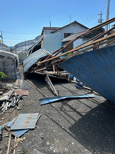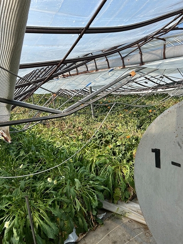 ハウスのビニールはどこかへ飛んでしまい、パイプは大きくひしゃげてしまった状態。