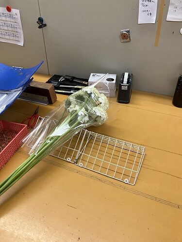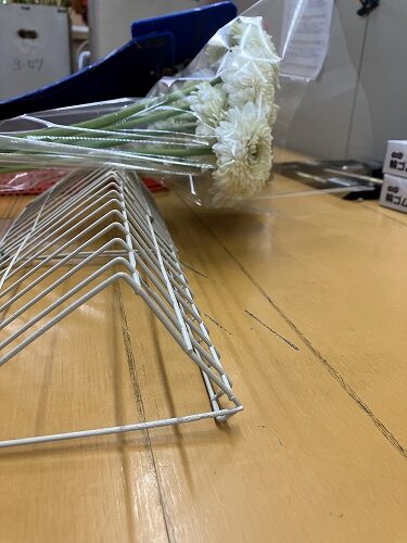 傷つけないためのひと工夫。ご覧ください、こちら。ガーベラの枕になっている白いワイヤー状の治具。
