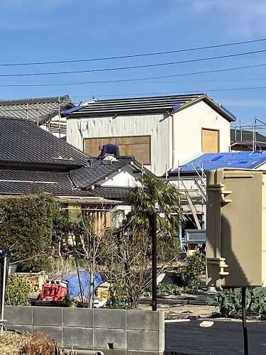人が屋根の上でちょうど修繕中。お気を付けて!