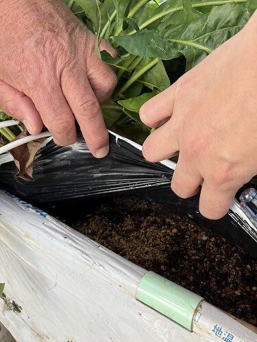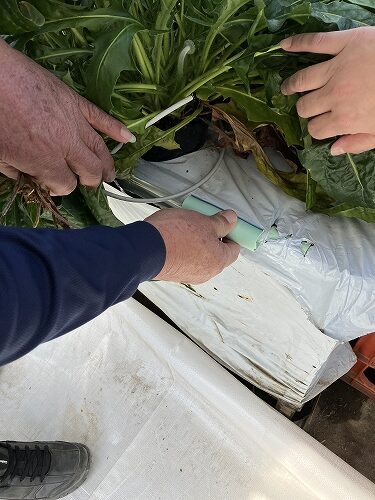 潅水は自動ではいかないので、みんなで手潅水を行って出荷したよ」