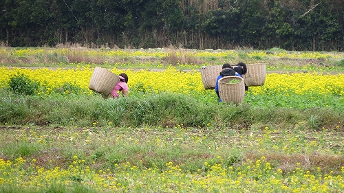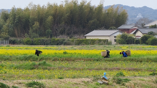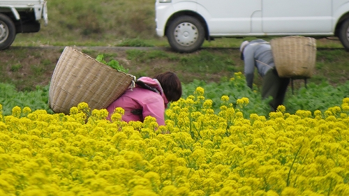 しかも、この一面の菜の花は、加藤さんのお父様が管理されているとかで、大きな籠を背中に背負って葉の花摘みをしているのは、加藤さんのお父様の会社の従業員さんなのだそうです~。
