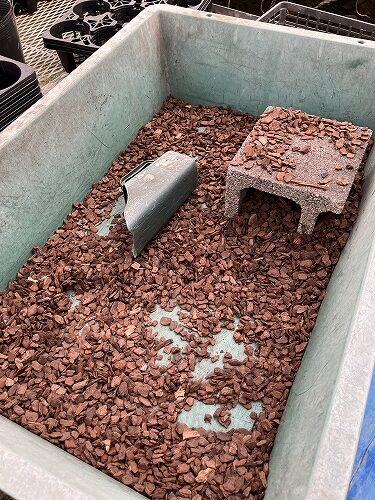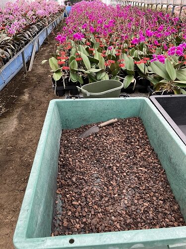 納品されたときのミズゴケごと、バークを使って鉢植えして定植完了。ハウス①で株を養成するというわけです。