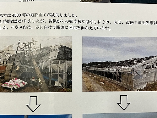 道路脇の電信柱も半分くらい倒れたようで、暫く停電にも悩まされましたが、ハウス内の管理は自家発電で対応したそうです。