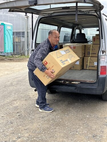 加藤さんも一緒に荷下ろし~(「今回の苗はずいぶん重いな・・・」と言いながら荷下ろしに励む加藤さん)