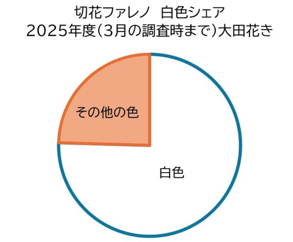 切花ファレノといえば、白が全体の4分の3(75%くらい)で、白品種の多くは台湾を中心とした輸入品。