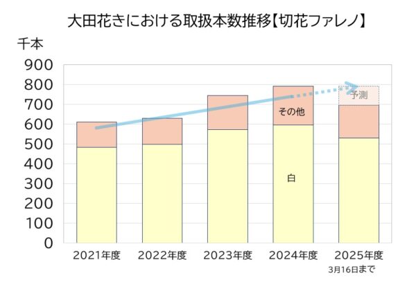 グラフにするとこの通り。切花ファレノ全体でも取扱数量が伸びてきています。(2025年度は3月16日時点まで)